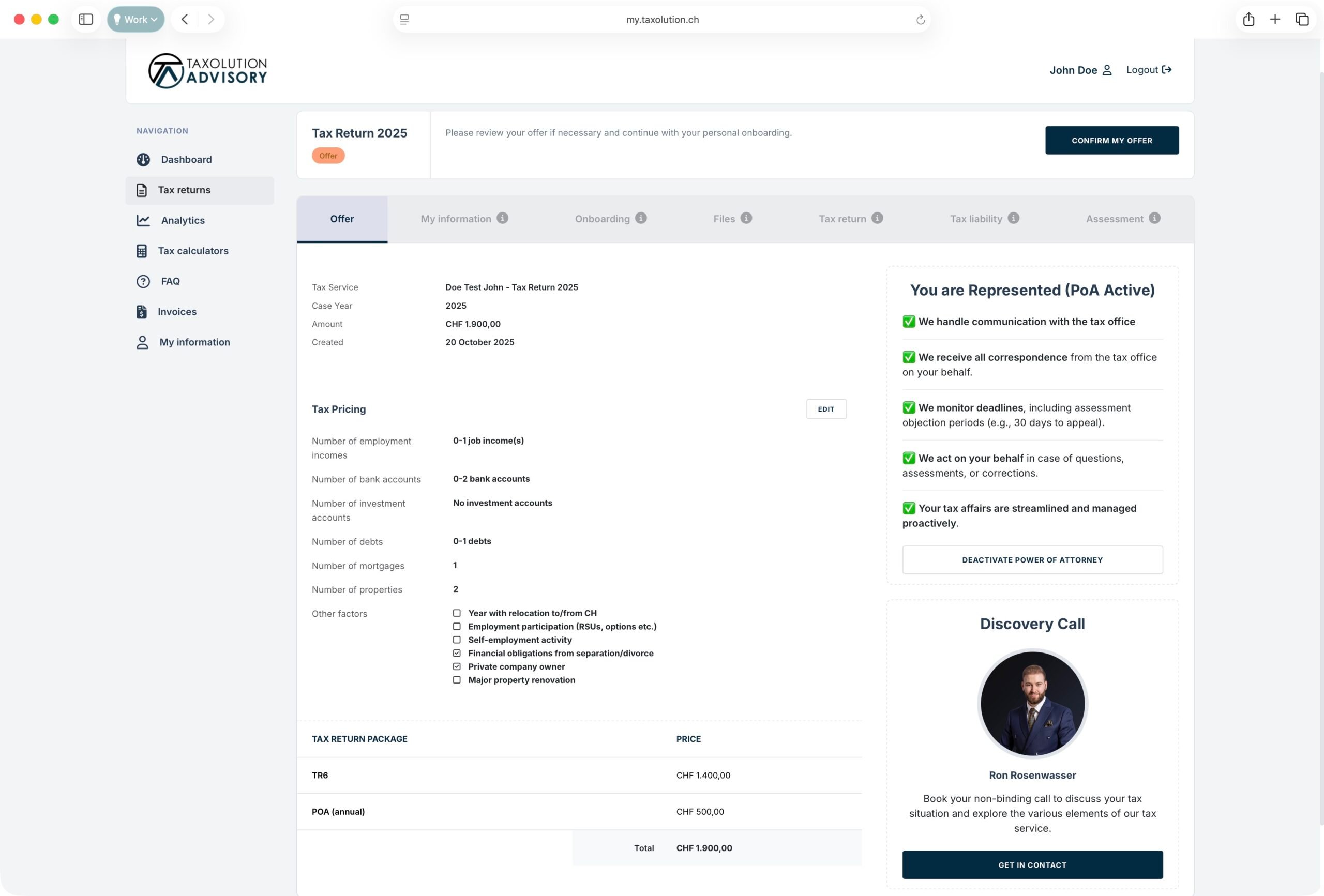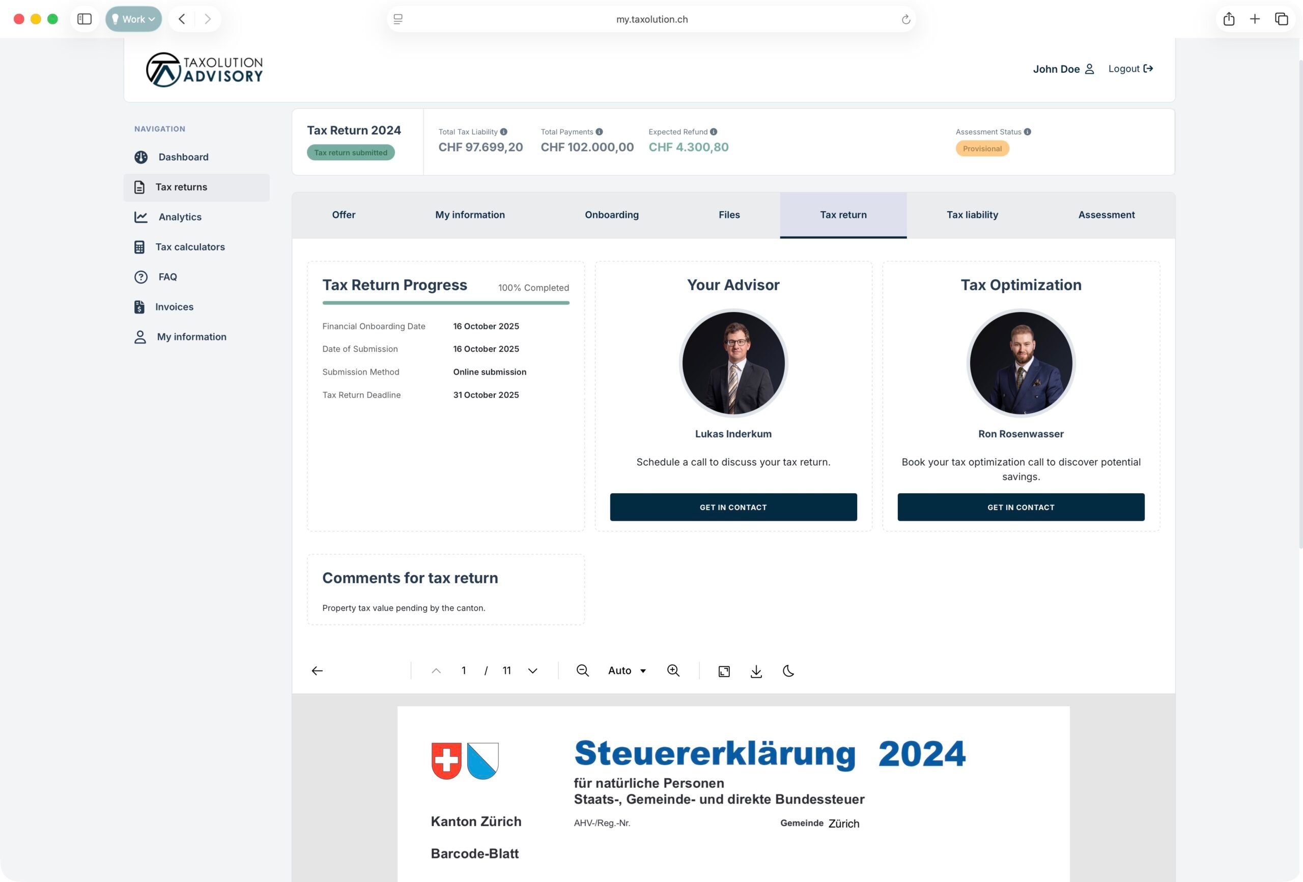 We have created a service that assists expats in navigating the Swiss tax system effortlessly, continuously enhancing it based on client feedback and our increasing number of cases. Central to this development is finding the right balance between digital processes and personalized attention to each client’s situation.